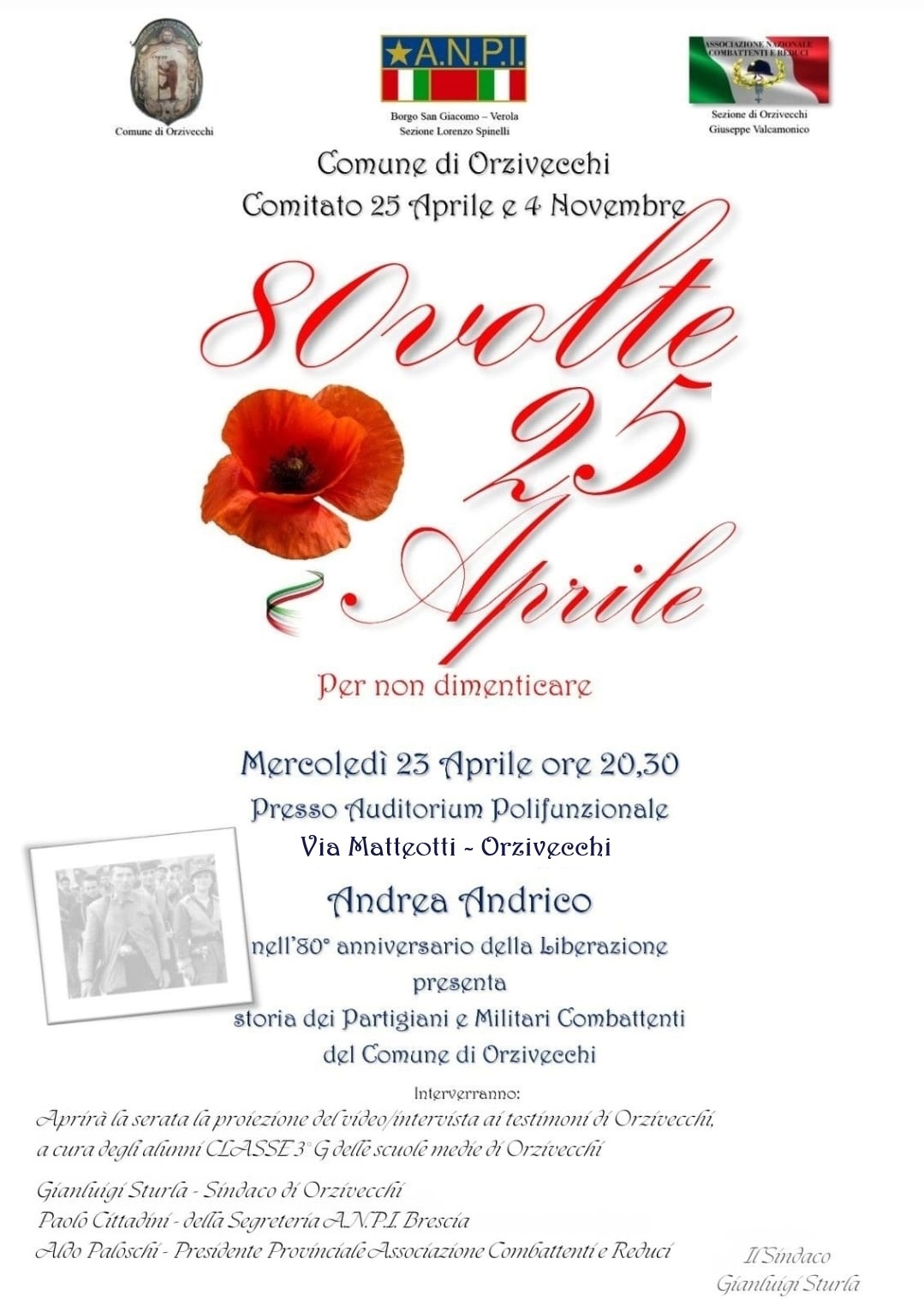 Mercoledì 23 Aprile 2025 ore 20.30 presso La Sala Manifestazioni Culturali presentazione "Storia dei Partigiani e militari combattenti del Comune di Orzivecchi" a cura di Andrea Andrico e proiezione del video intervista ai testimoni di Orzivecchi a cura degli alunni classe 3G della Scuola secondaria di primo grado di Orzivecchi