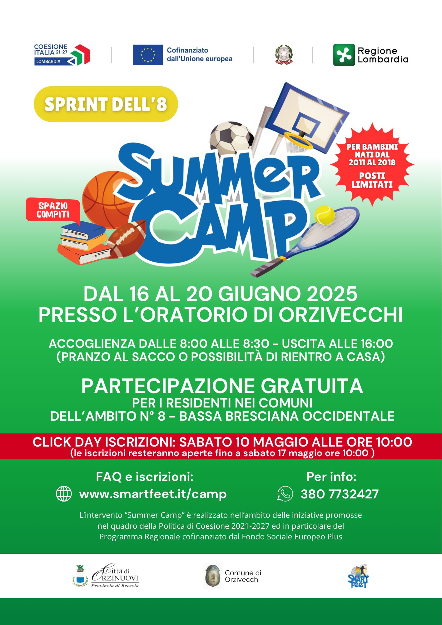 L’iniziativa, promossa nell’ambito del progetto “SPRINT! LOMBARDIA INSIEME e sostenuta dal Fondo Sociale Europeo Plus, offre un programma ricco di attività sportive e ricreative, con accoglienza dalle 8:00 alle 8:30 e uscita alle 16:00.